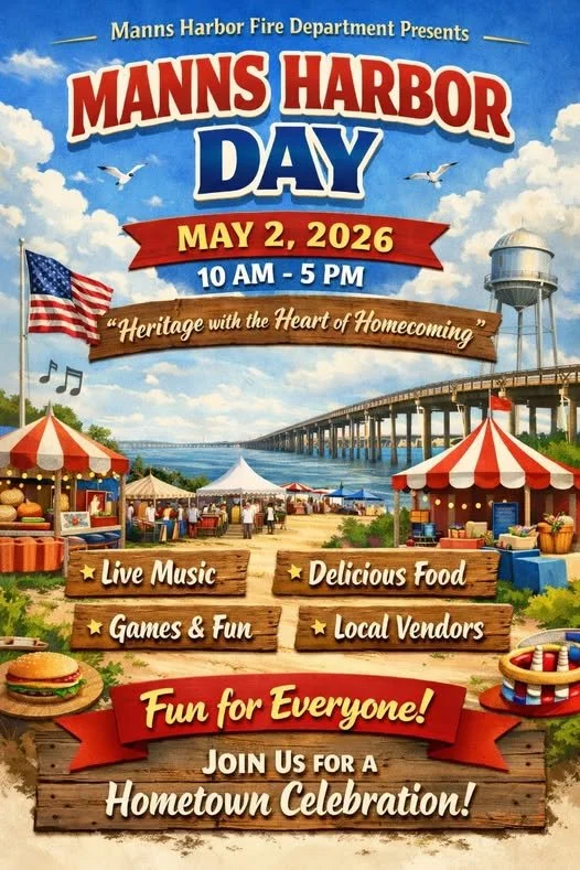 Manns Harbor Day is back and shaping up to be one of our biggest community celebrations yet. Join us on Saturday, May 2nd from 10:00 AM to 5:00 PM for a full day of local flavor, family fun, and hometown pride. (Rain date: May 9th.)